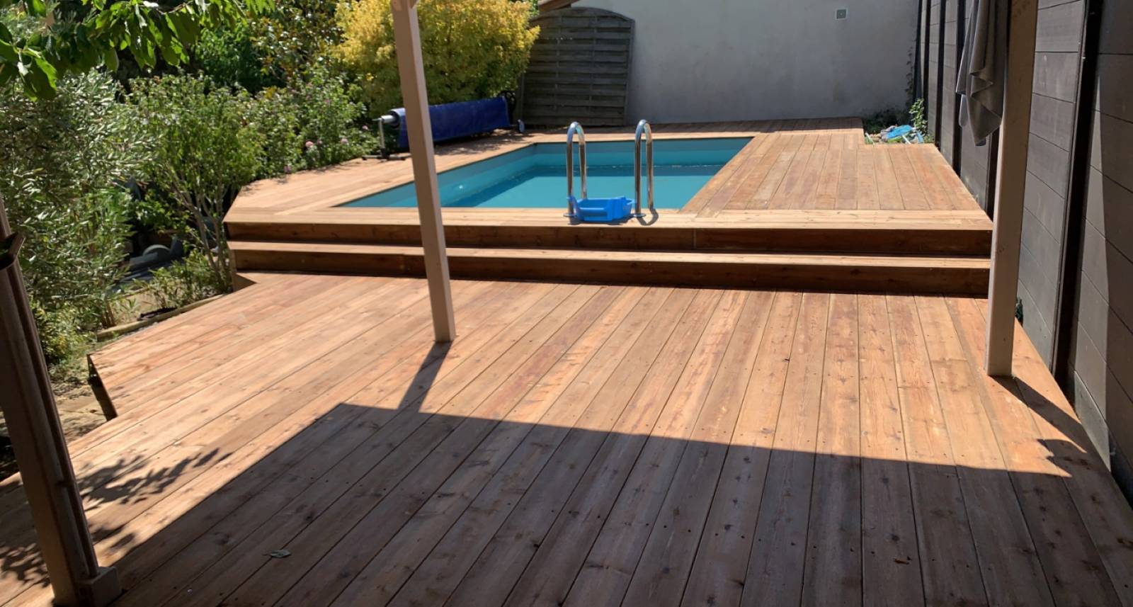 Construction d’une terrasse en bois afin d’aménager un espace de détente autour de la piscine.